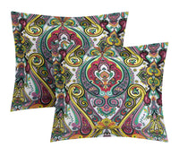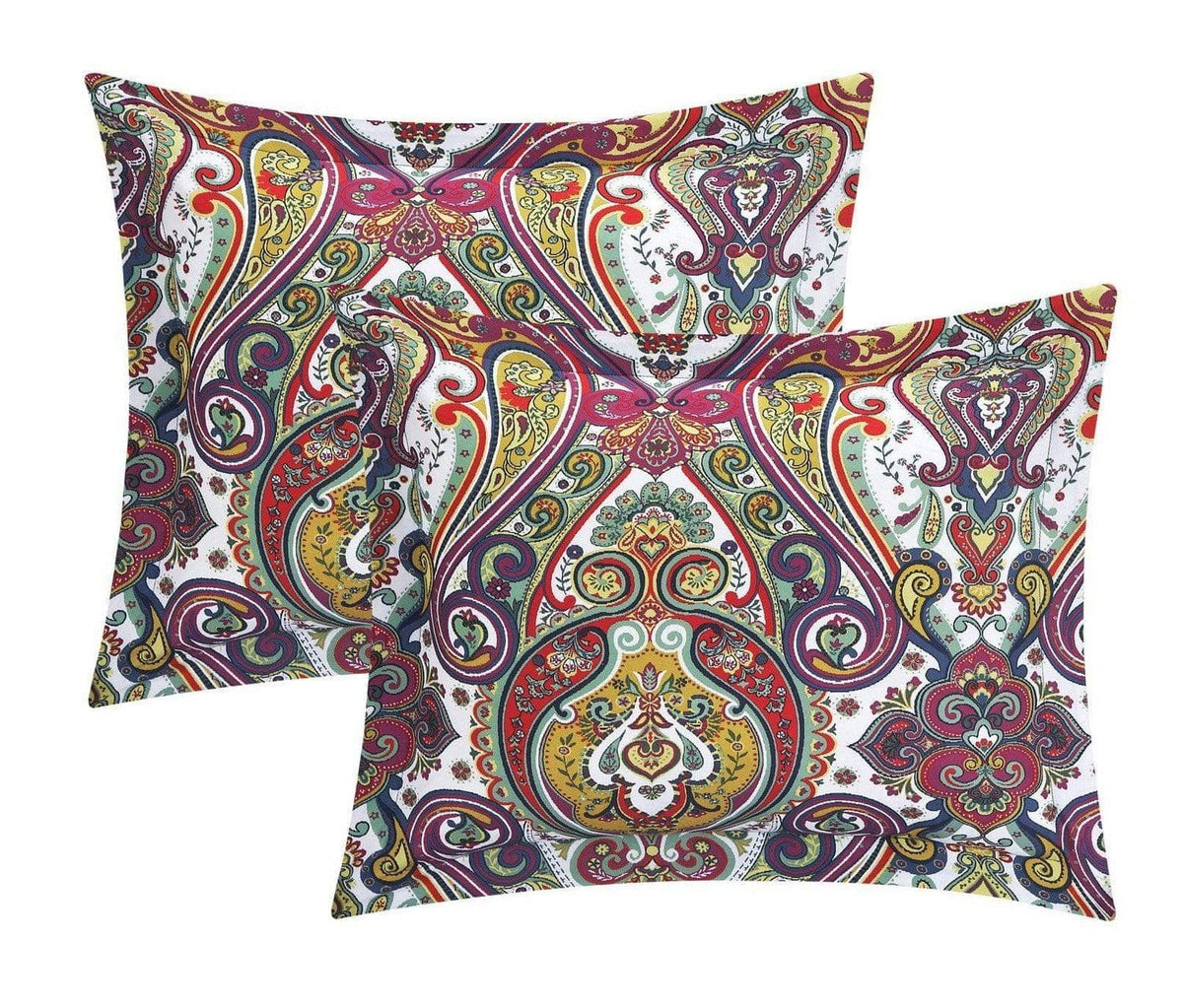 A fashion forward reversible comforter set featuring a Boho inspired paisley print and contemporary geometric patterned technique. Design coordinated shams and deco pillows are included to complete the look.