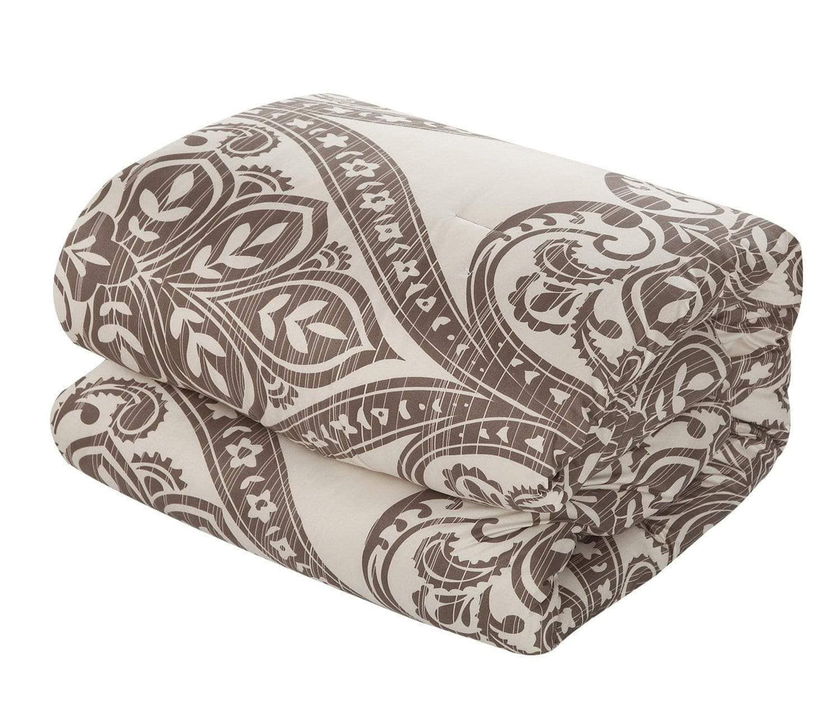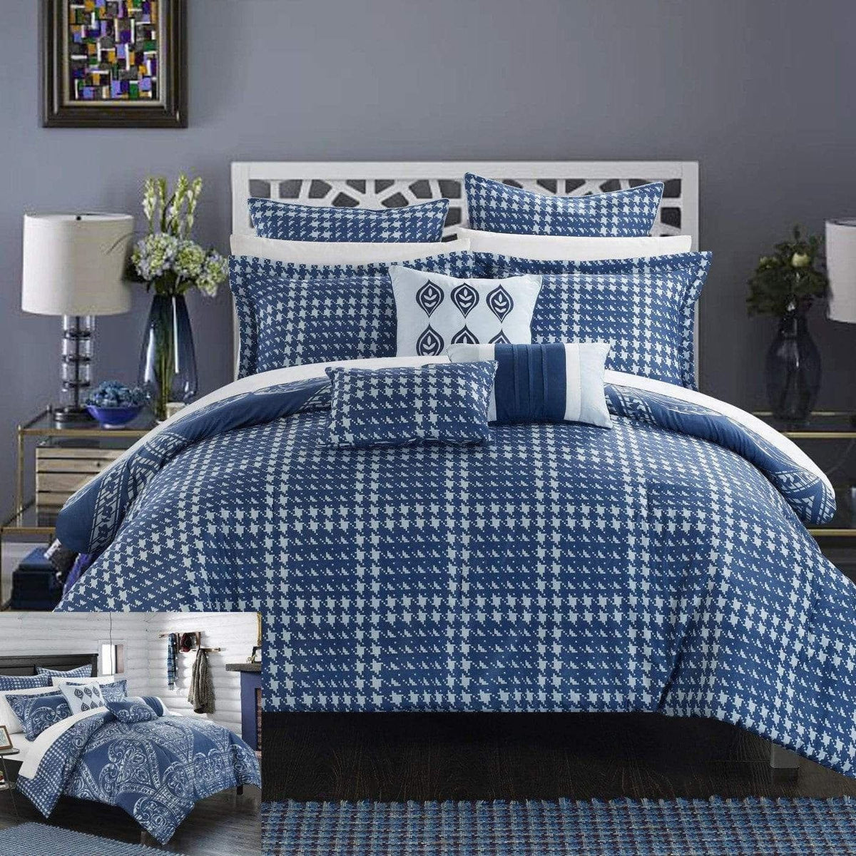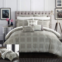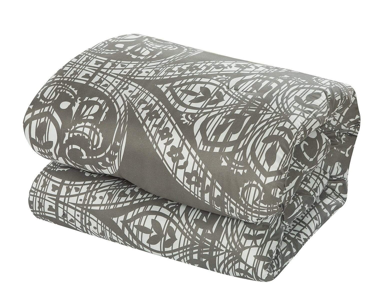 A fashion forward bed in a bag Jacquard comforter set with everything you need for a complete bedroom décor makeover. The comforter features a traditional scroll Jacquard motif on the face with a contemporary houndstooth pattern on the reverse Super soft microfiber sheet set, design coordinated shams and embellished deco pillows are included to complete the look.