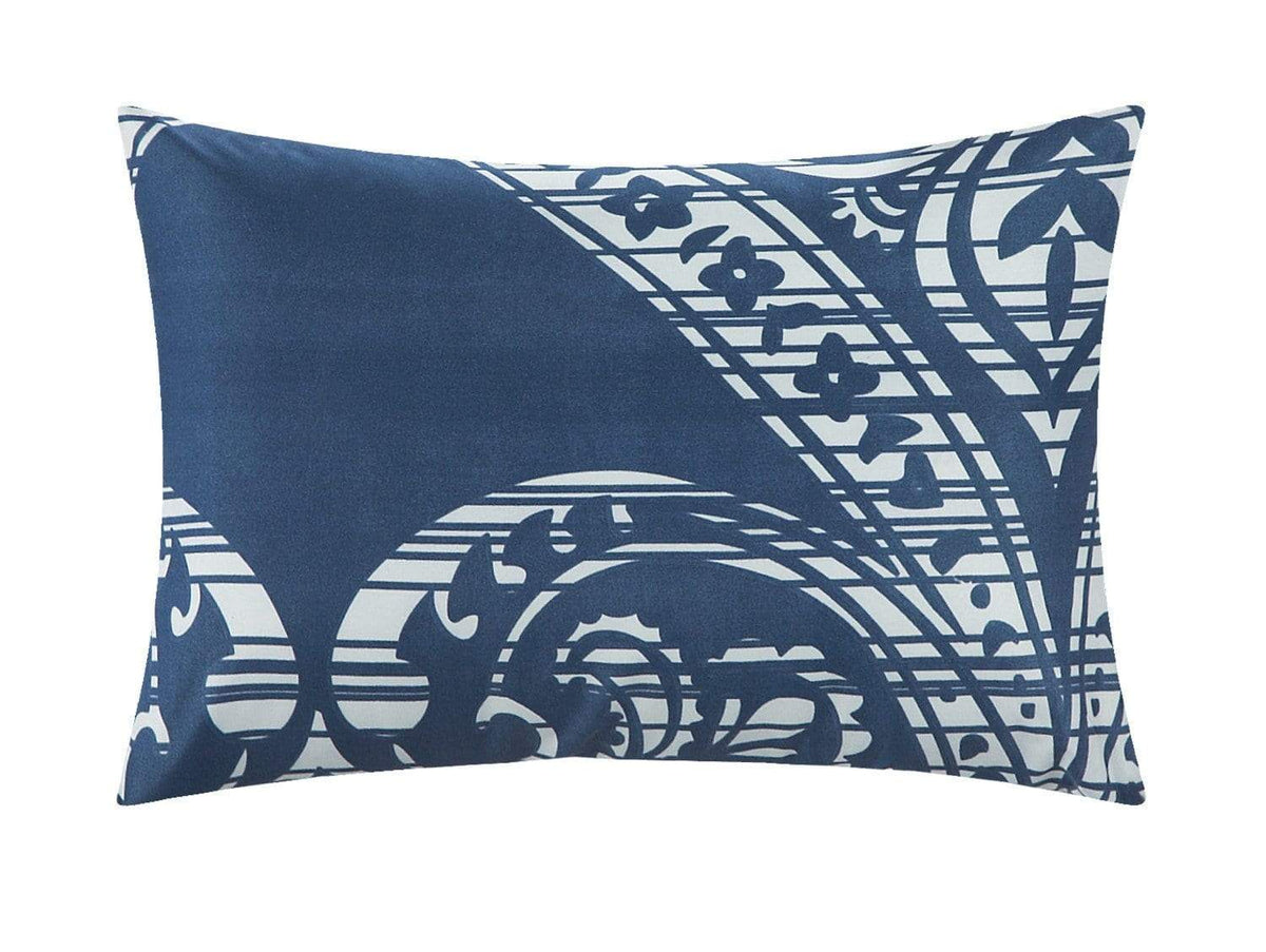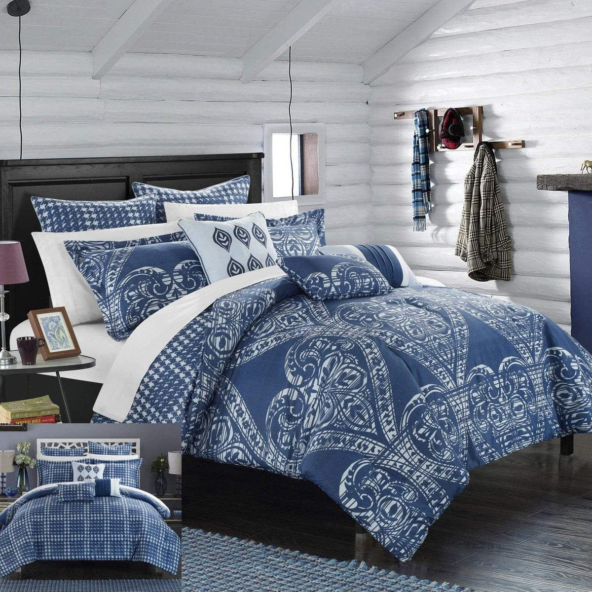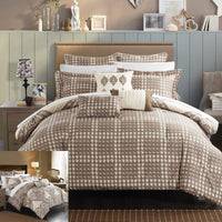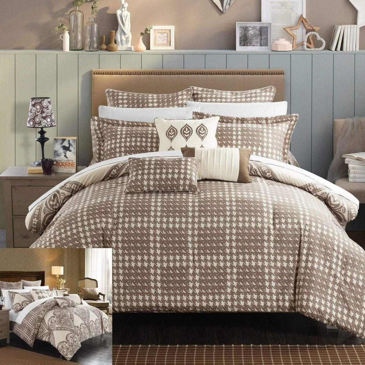 A fashion forward bed in a bag Jacquard comforter set with everything you need for a complete bedroom décor makeover. The comforter features a traditional scroll Jacquard motif on the face with a contemporary houndstooth pattern on the reverse Super soft microfiber sheet set, design coordinated shams and embellished deco pillows are included to complete the look.