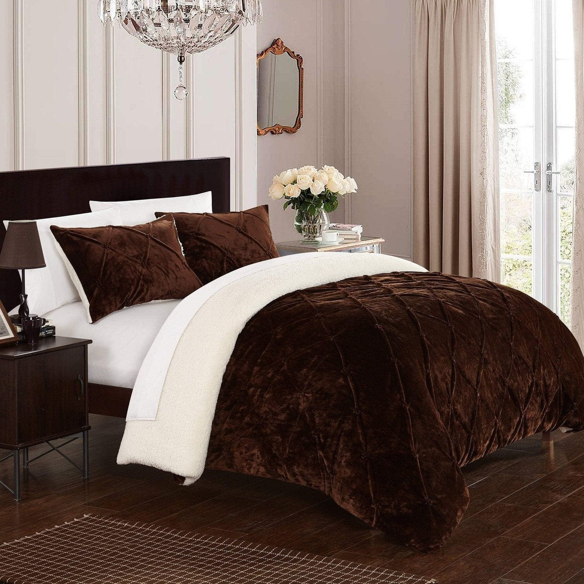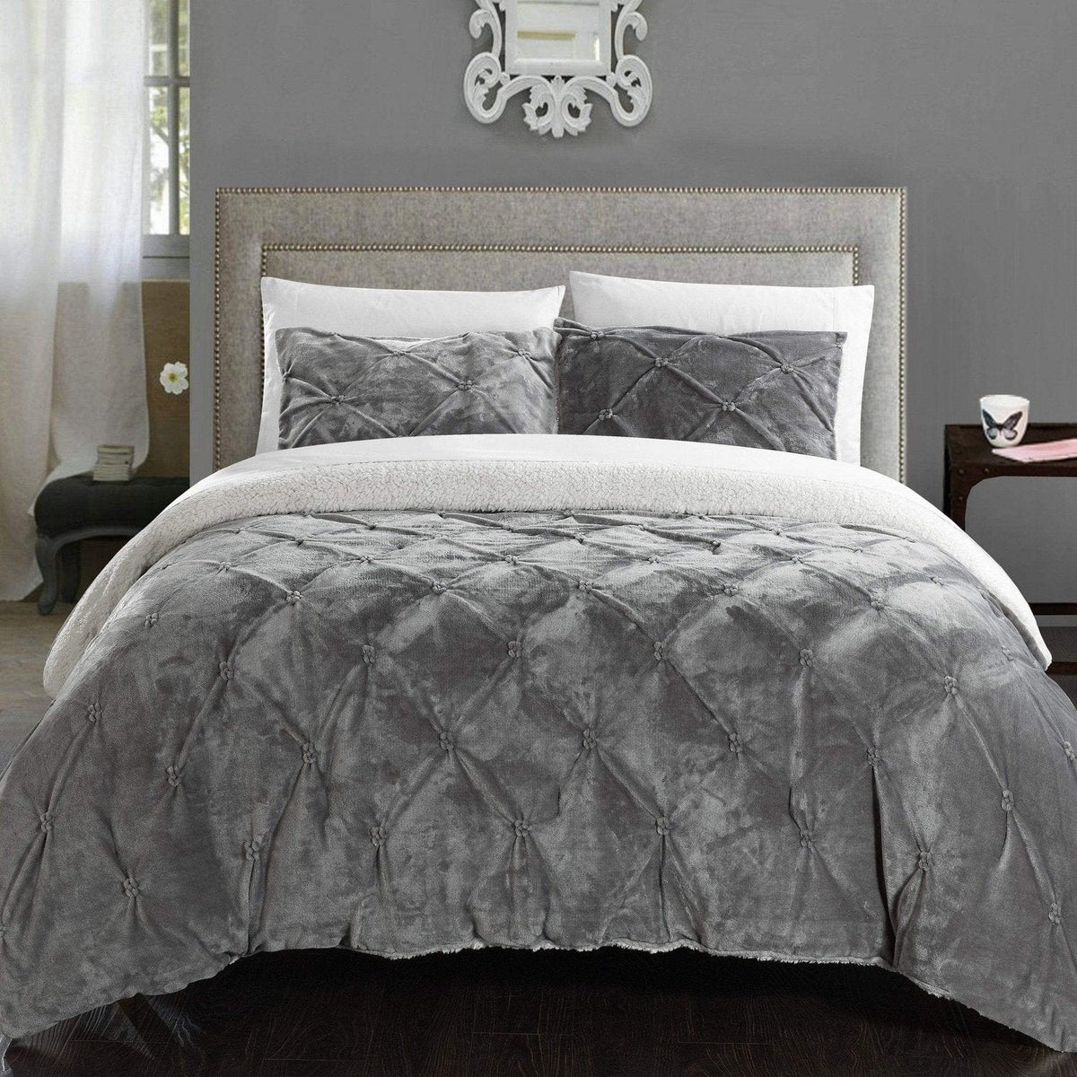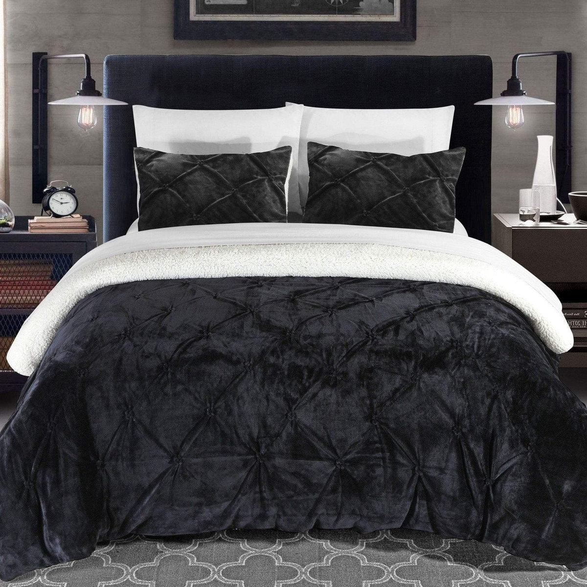 Treat yourself with this gorgeous super plush, super warm Sherpa comforter set with design coordinated shams. Made with a new technique that highlights a pinch pleat style with ruffled and pleated details. Stunning colors guaranteed to enhance any room or decor all year round.