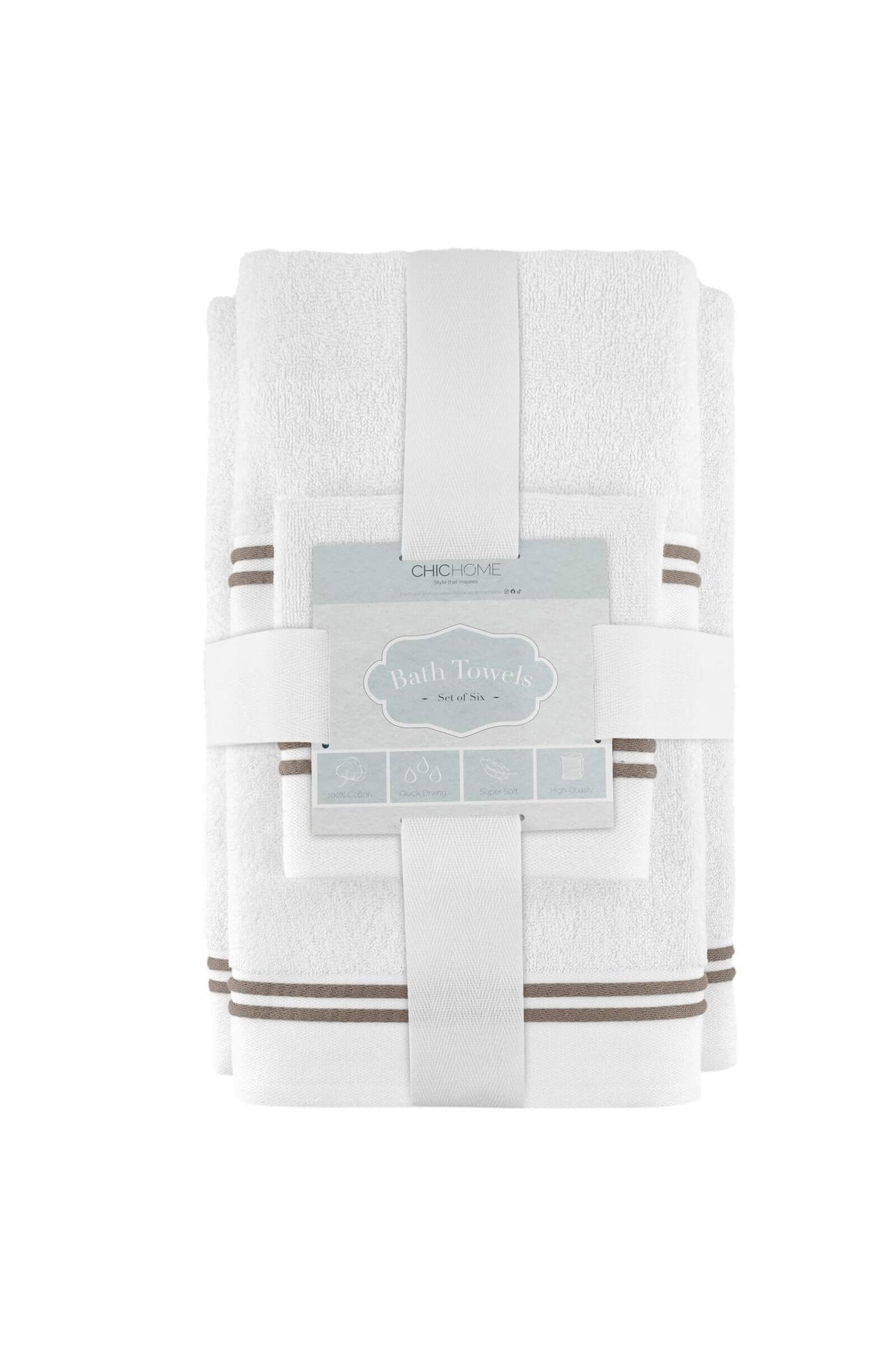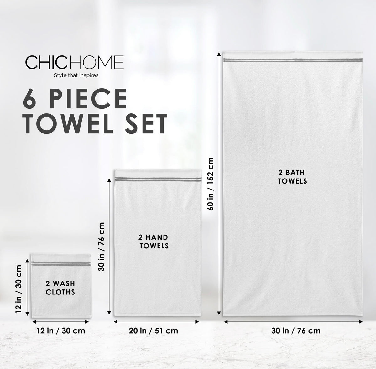 Immerse yourself in the luxurious comfort of the Chic Home 6-Piece Turkish Cotton Towel Set, boasting a classic white base accented by a sophisticated striped hem. Crafted from organic, 100% genuine Turkish cotton, each towel embodies superior softness and absorbency, establishing a unique mix of indulgence and utility. This set comprises 2 bath towels, 2 hand towels, and 2 washcloths, all featuring a striped hem design that effortlessly elevates any bathroom decor. Reward yourself daily with this plush, spa-like towel set that ensures an extraordinary bathing experience.