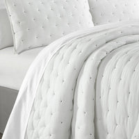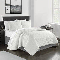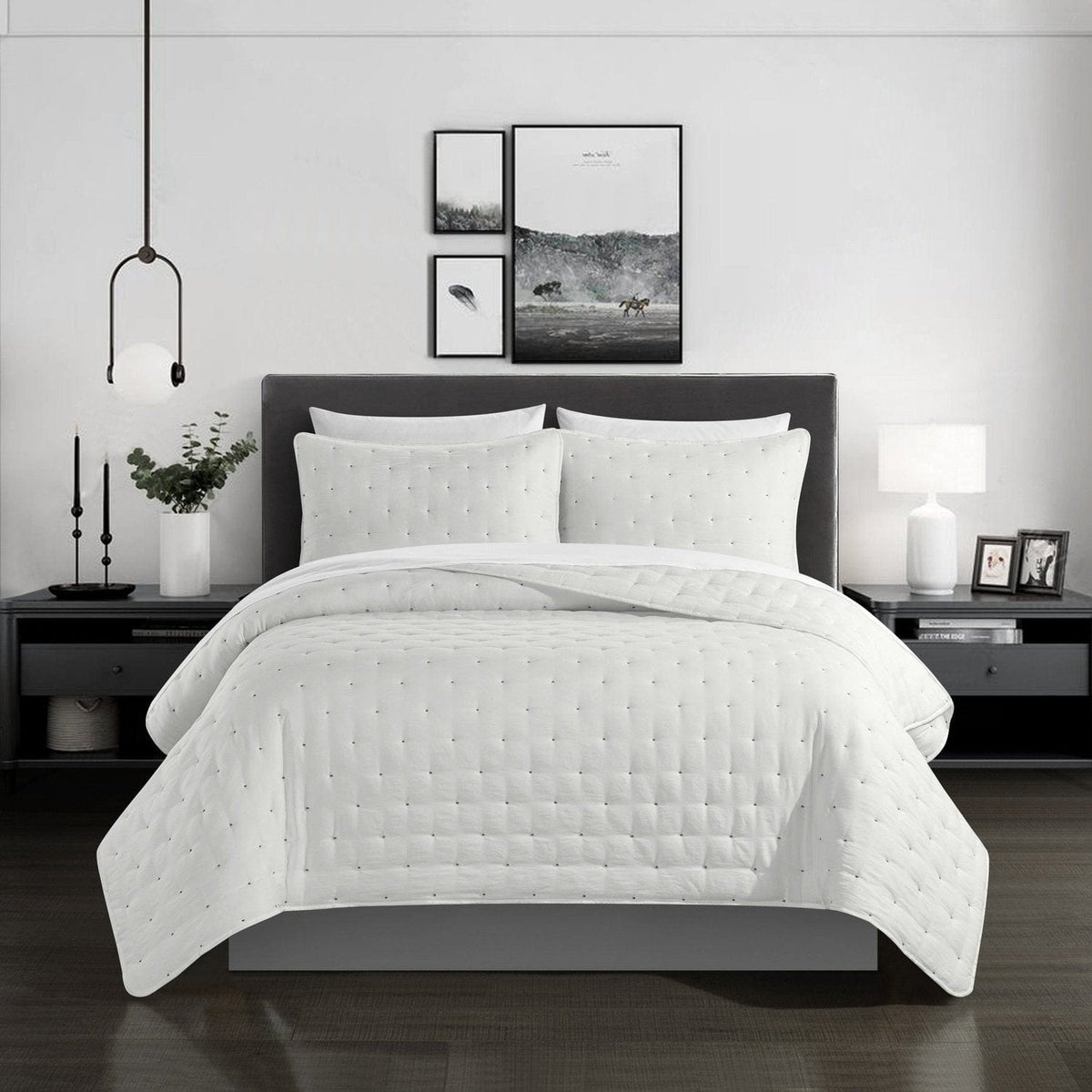 Give your bedroom a fresh, clean look with the laid back style of the Chyle quilt set from Chic Home. This quilt features a tufted cross stitched design on the face. Two design coordinated pillow shams complete the look. A four piece sheet set (1 fitted sheet, 1 flat sheet and 2 pillowcases) is included with every set.