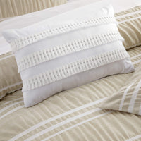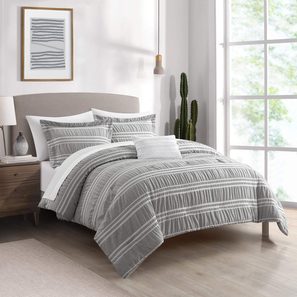 Introducing the Emma comforter set, made from premium seersucker, this bed set's texture and stripes radiate sophistication. The plush poly-silk filling ensures comfort throughout the year. An added touch of luxury comes with a decorative pillow, adorned with chic tassels. Paired with matching pillow shams*, the Emma comforter from Chic Home embodies modern elegance and cozy indulgence, making it a perfect addition to any bedroom seeking a blend of style and comfort.