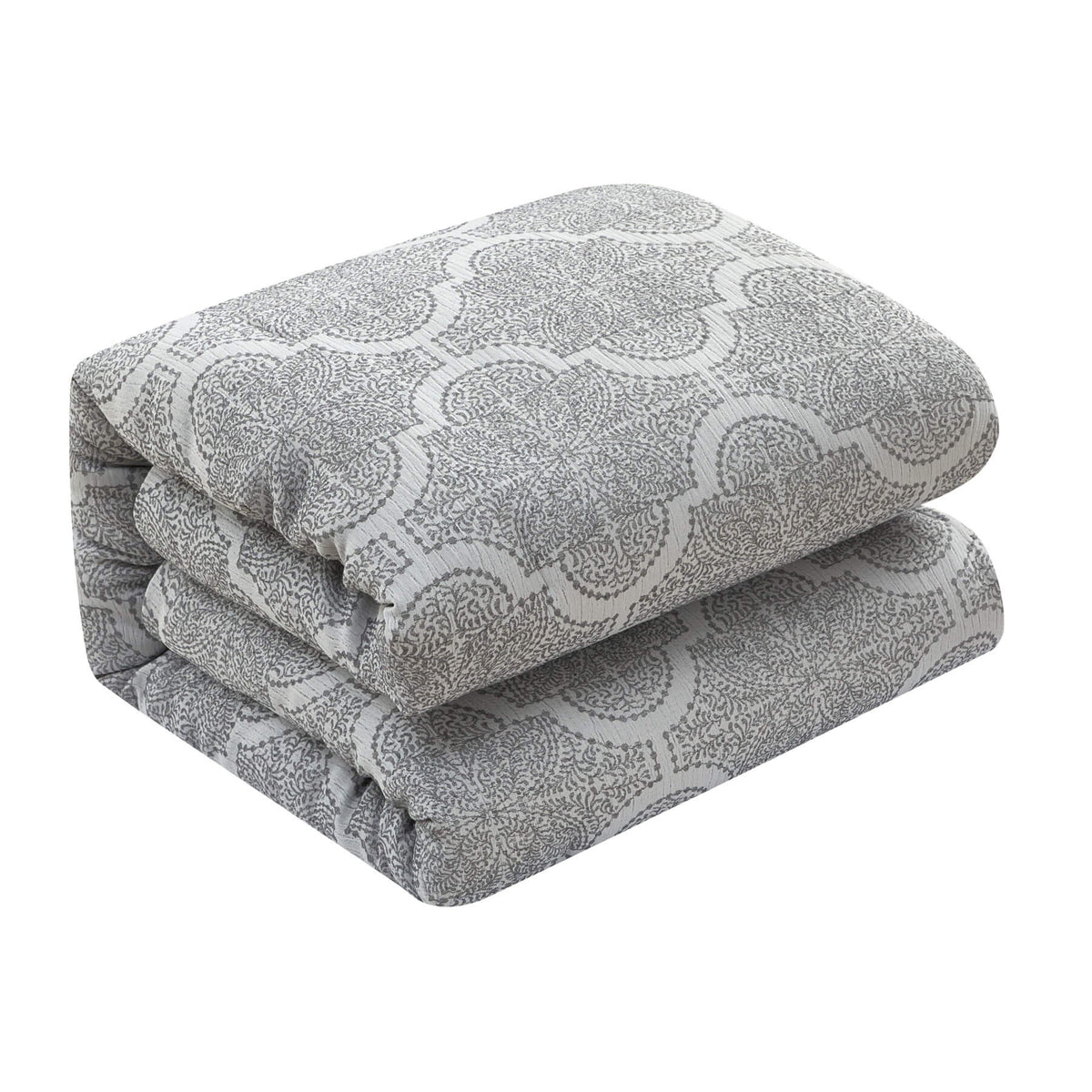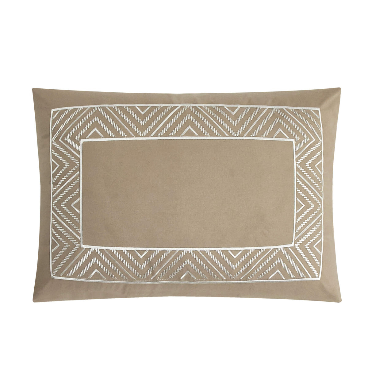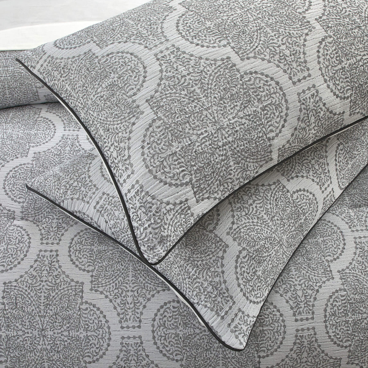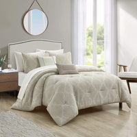 Indulge in the refined comfort of the Chic Home Kenji comforter set, fashioned from double-layered gauze jacquard for a rich, textured look and feel. The neutral hued palette brings a warm and inviting atmosphere to your bedroom. Accompanying the set, the pillow shams mirror the comforter's intricate, geometric pattern, and the decorative pillows—one embroidered and one with elegant pleating—add a touch of artisanal charm. This ensemble not only elevates your bedroom's aesthetic but also envelops you in luxury night after night. Completing the collection is a crisp white 4-piece sheet set, with two pillowcases, a flat sheet, and a fitted sheet.