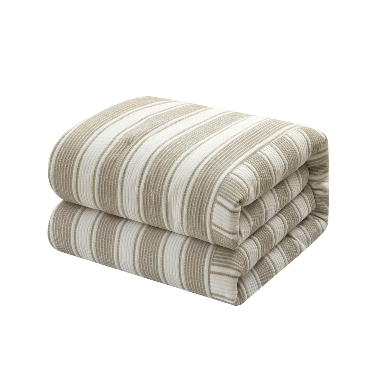 Transform your bedroom with the Lydia comforter set. This comforter features a refined striped design in luxurious chenille, accentuated by serene beige and taupe hues. The plush chenille not only looks sophisticated but also offers immense comfort. Adding to its opulence, the Lydia comforter is filled with smooth poly-silk, ensuring an extra layer of coziness. Accompanied by two striped pillow shams and two decorative pillows, this set epitomizes both style and unmatched comfort.