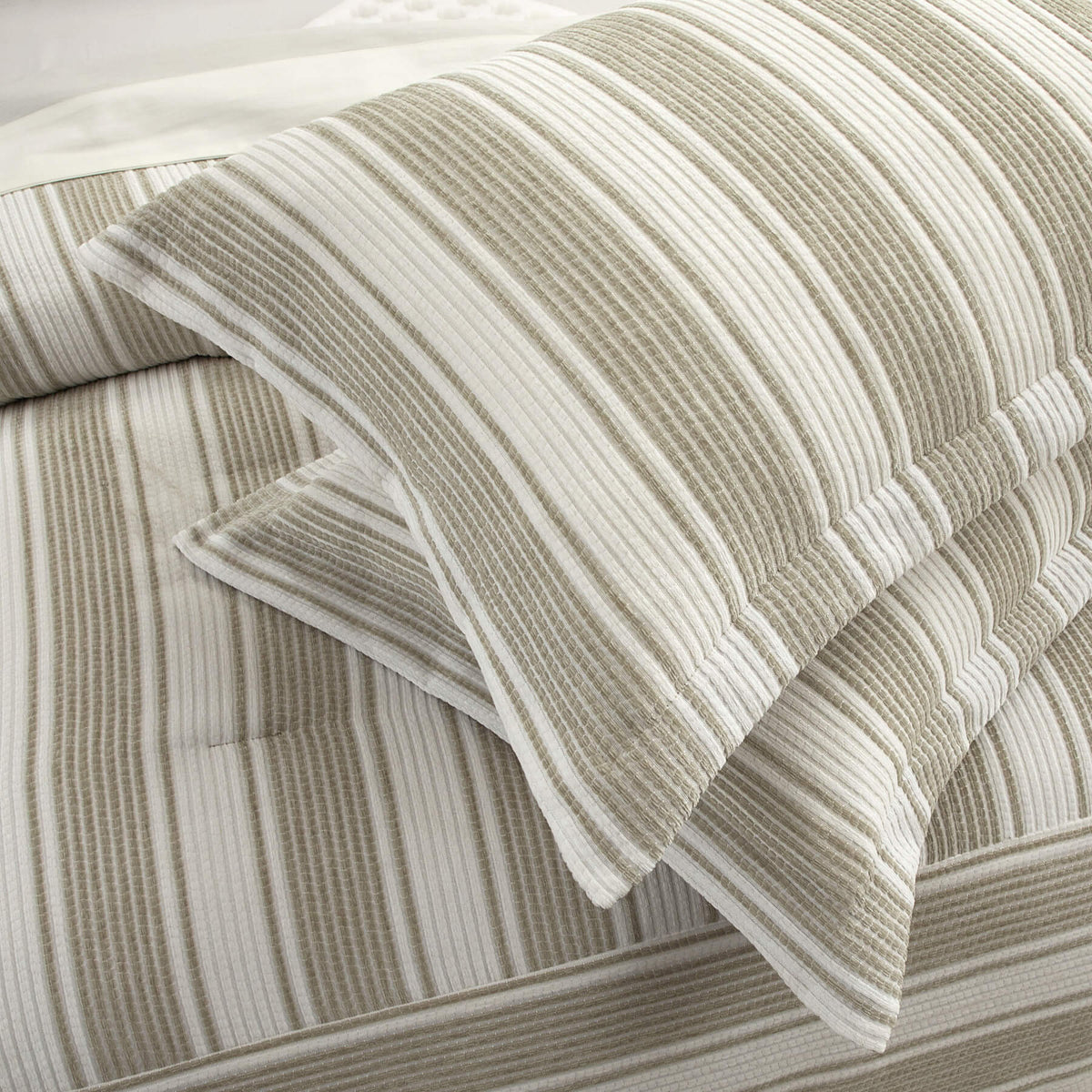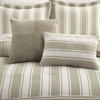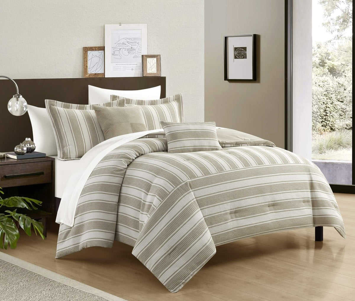Transform your bedroom with the Lydia comforter set. This comforter features a refined striped design in luxurious chenille, accentuated by serene beige and taupe hues. The plush chenille not only looks sophisticated but also offers immense comfort. Adding to its opulence, the Lydia comforter is filled with smooth poly-silk, ensuring an extra layer of coziness. Accompanied by two striped shams and decorative pillows, the set also offers a four-piece white sheet set: a fitted sheet, a flat sheet, and two pillowcases.