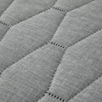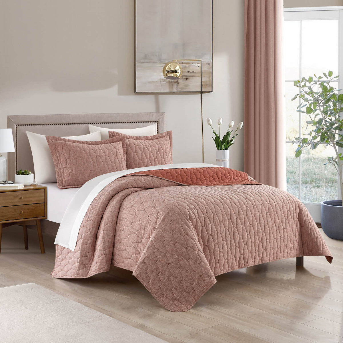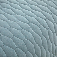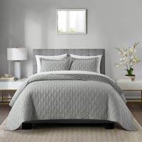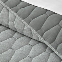 Discover the blend of geometry and luxury with the Nyla quilt set from Chic Home. Made from melange yarn enhanced by a cationic process, its hexagonal design boasts a two-tone, heathered allure. The unique melange blend not only offers a visually distinct appeal but also provides a soft, natural touch. Paired with two matching shams, it transforms your nights into a chic urban escape. A four piece white sheet set (1 fitted sheet, 1 flat sheet and 2 pillowcases) is included with every set.
