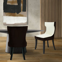 The Conrad side dining chair from Iconic Home is a mixed material interpretation of a modern silhouette. Design details abound from a gently curved, cutout frame to mixed upholstery for a PU leather front and finished with a luxe velvet back. Espresso legs finish the look of this fashionable chair.