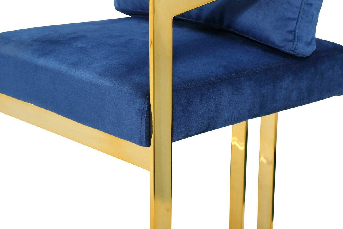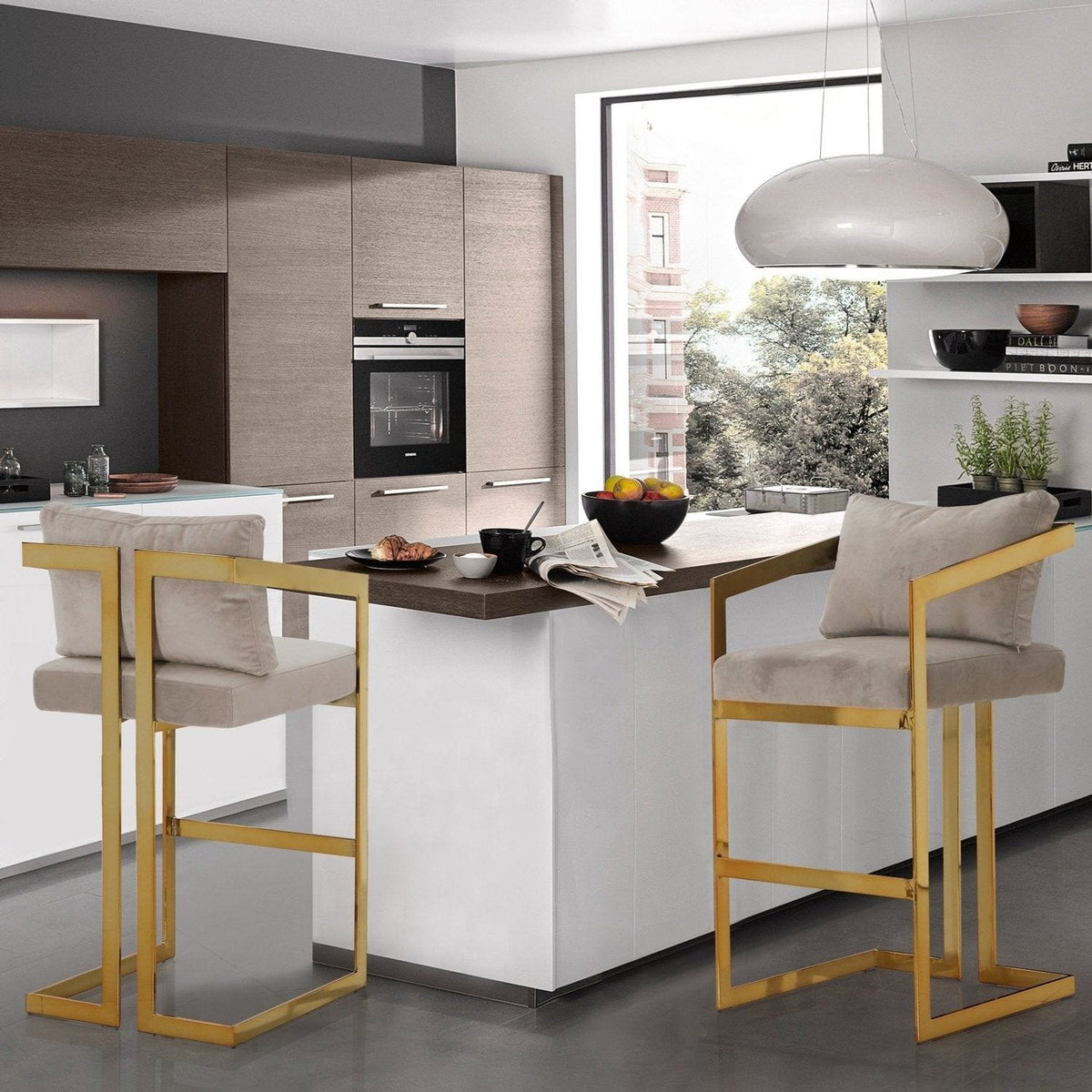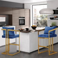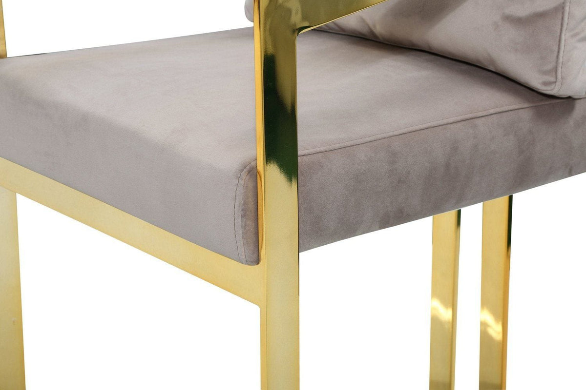The Layla Bar stool is the ideal blend of contemporary design and comfortable function. Clean architectural lines are created by a sculptural gold plated metal frame while a mid-back, lux velvet upholstered seat and a footrest bar provide for superior comfort. The Layla Bar stool works great in multiples and sits beautifully in kitchen, dining and lounge areas.