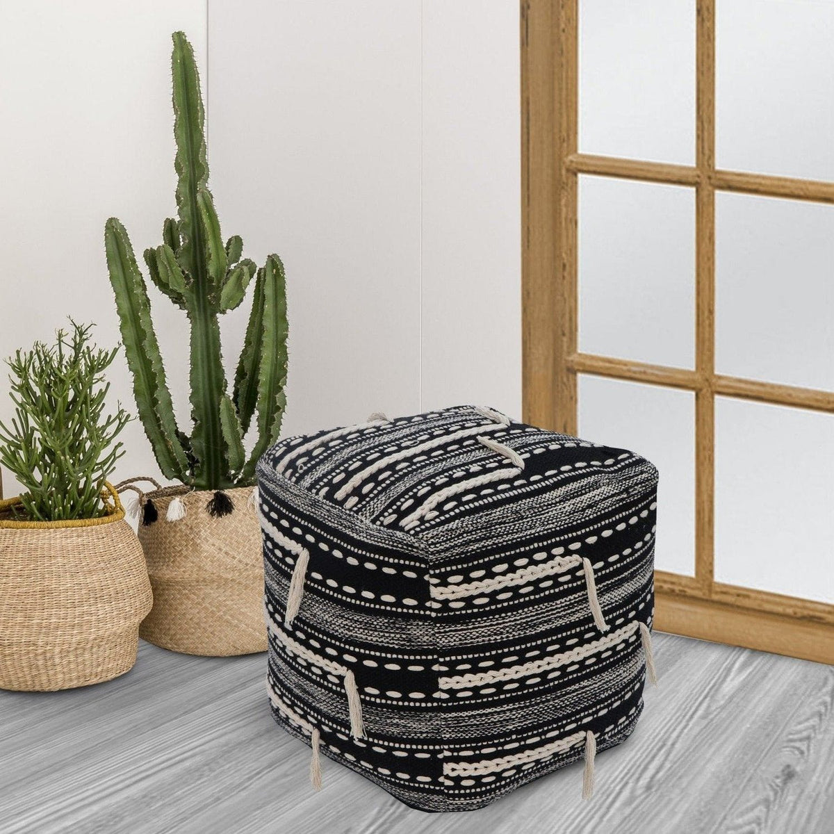 The Spike square pouf ottoman doubles as extra seating and functional decor for virtually any environment. A beautiful blend of both contemporary and traditional design elements, this piece is upholstered in woven cotton and features a two-tone striped design with tassels. Use the Spike in multiples to add a touch of timeless elegance to any room in your house.