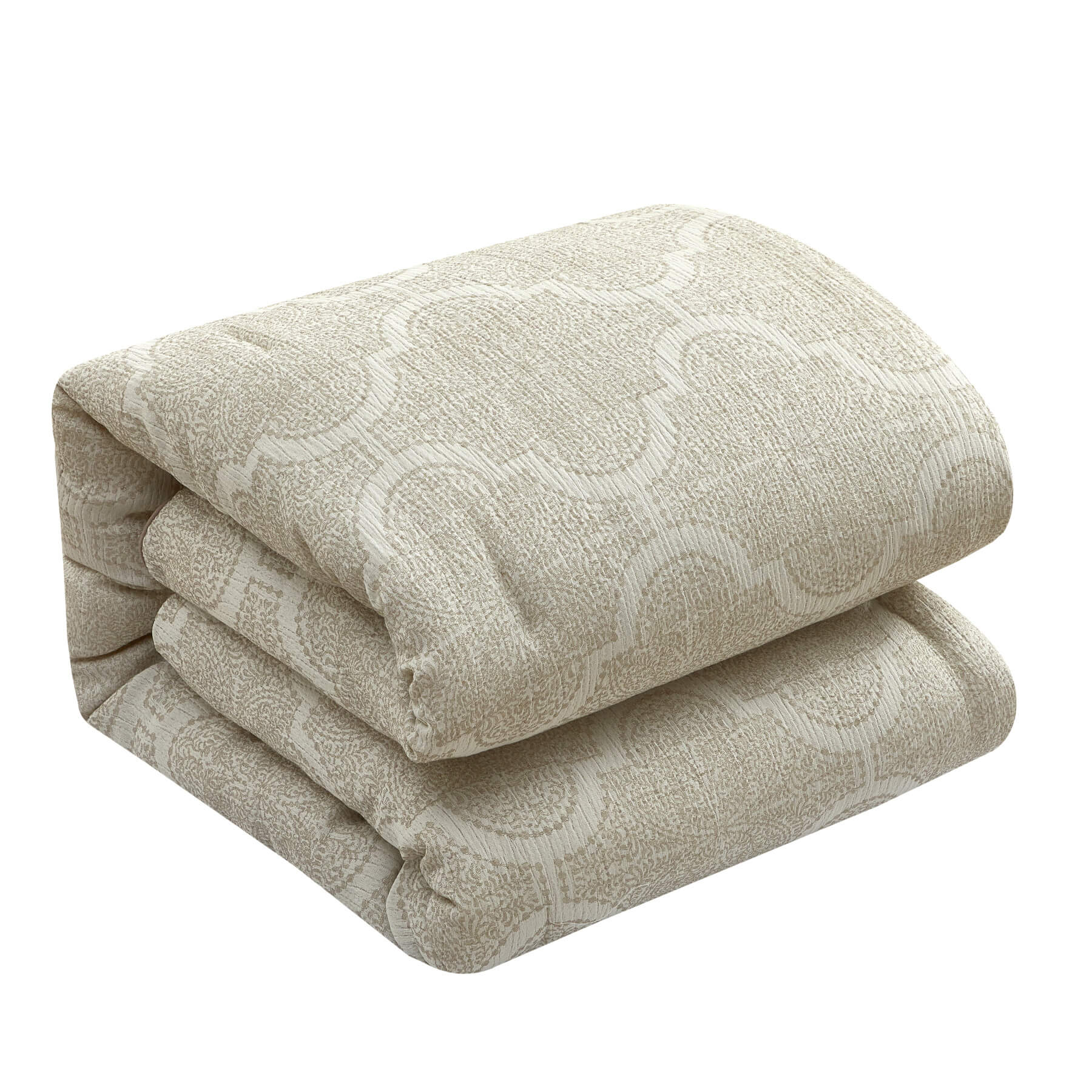 Indulge in the refined comfort of the Chic Home Kenji comforter set, fashioned from double-layered gauze jacquard for a rich, textured look and feel. The neutral hued palette brings a warm and inviting atmosphere to your bedroom. Accompanying the set, the pillow shams mirror the comforter's intricate, geometric pattern, and the decorative pillows—one embroidered and one with elegant pleating—add a touch of artisanal charm. This ensemble not only elevates your bedroom's aesthetic but also envelops you in luxury night after night. Completing the collection is a crisp white 4-piece sheet set, with two pillowcases, a flat sheet, and a fitted sheet.